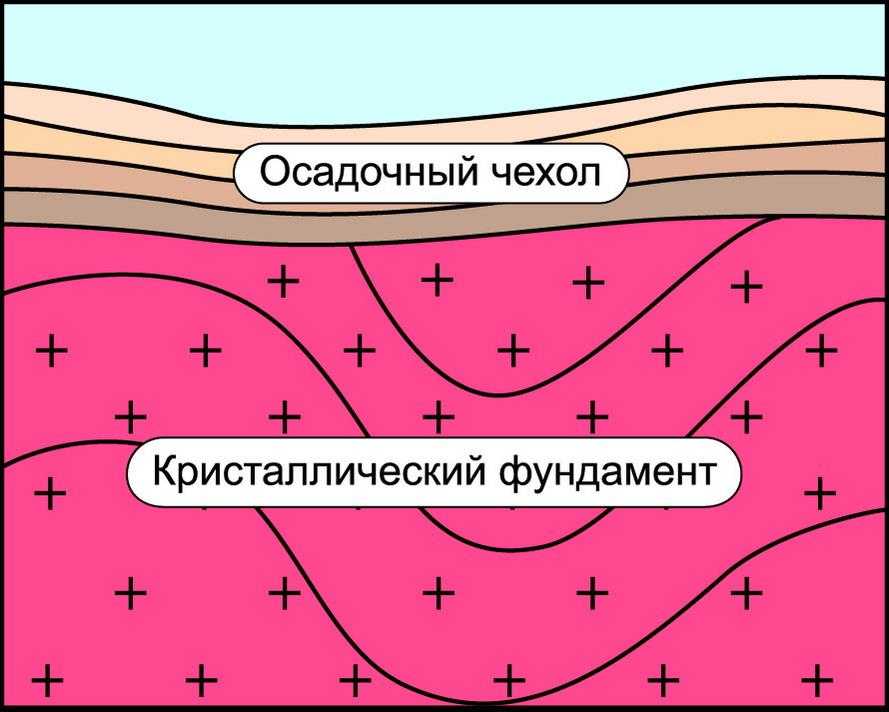 Платформы и древние, и молодые имеют двухъярусное строение – кристаллический фундамент, образованный метаморфизированными породами, и осадочный чехол. Фундамент является нижним структурным этажом и его формирование проходило в течение длительного времени (более $2$ млрд. лет). Затем он подвергся сильному размыву и денудации. Фундамент называют кристаллическим, потому что среди пород его слагающих, преобладают граниты и гнейсы.