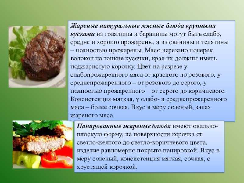 быть слабо, средне и хорошо прожарены, а из свинины и телятины – полностью прожарены. Мясо нарезано поперек волокон на тонкие кусочки, края их должны иметь поджаристую корочку. Цвет на разрезе у слабопрожаренного мяса от красного до розового, у среднепрожаренного – от розового до серого, у полностью прожаренного – от серого до коричневого. Консистенция мягкая, у слабо- и среднепрожаренного мяса – более сочная. Вкус в меру соленый, запах жареного мяса.