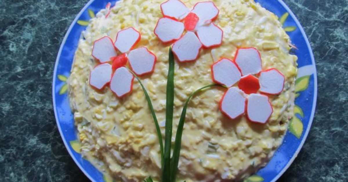 Крабовый салат можно посыпать сверху кукурузой, украсить дольками крабовых палочек или розочкам, сделанными из них. Как закуску можно подавать сухарики или снэки, поэтом их можно как бы небрежно положить с одной стороны салатницы. Интересным будет и дополнение в виде морепродуктов, например, креветок или пары кусочков красной рыбы, но исключительно, как элемент декора.