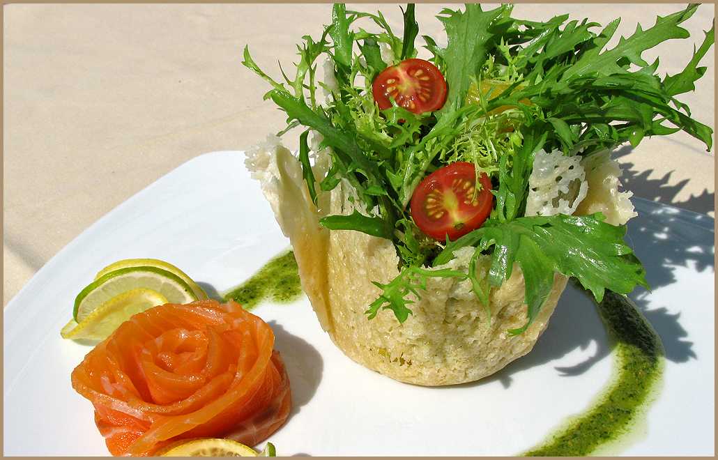 Некоторые примеры украшения салатов дома и в ресторане.