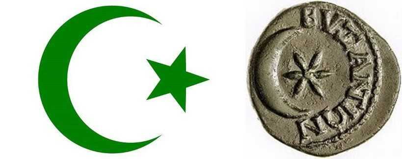 Слева — мусульманский полумесяц со звездой. Справа — византийская монета с гербом Константинополя.