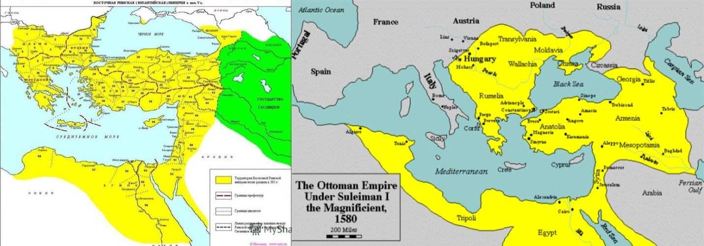 Слева — карта Восточной Римской империи в 395 г. Справа — Османская империя в период максимального могущества, 1580 г.