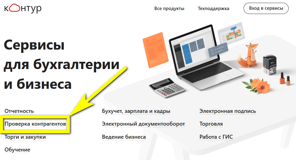 Перейти на главную страницу компании по адресу и в размещённом сразу под названием сайта разделе «Сервисы для бухгалтерии и бизнеса» выбрать щелчком мыши ссылку «Проверка контрагентов».