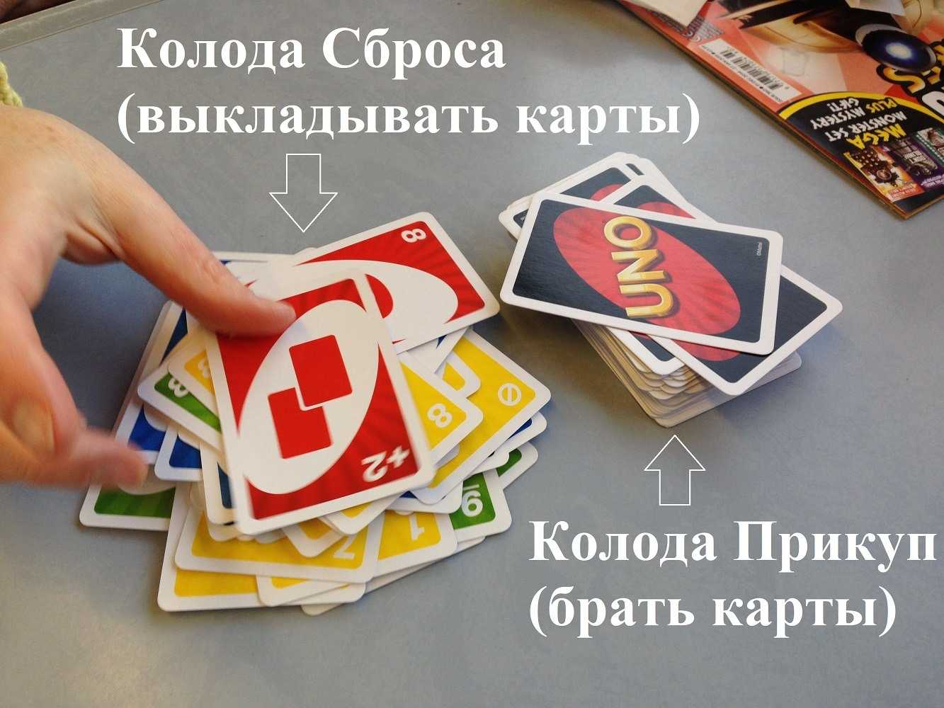 - Ведущий берет из этой колоды первую, переворачивает вверх рубашкой и открывает колоду Сброса. Это начальная карта, на которую в процессе игры будут сбрасываться другие.