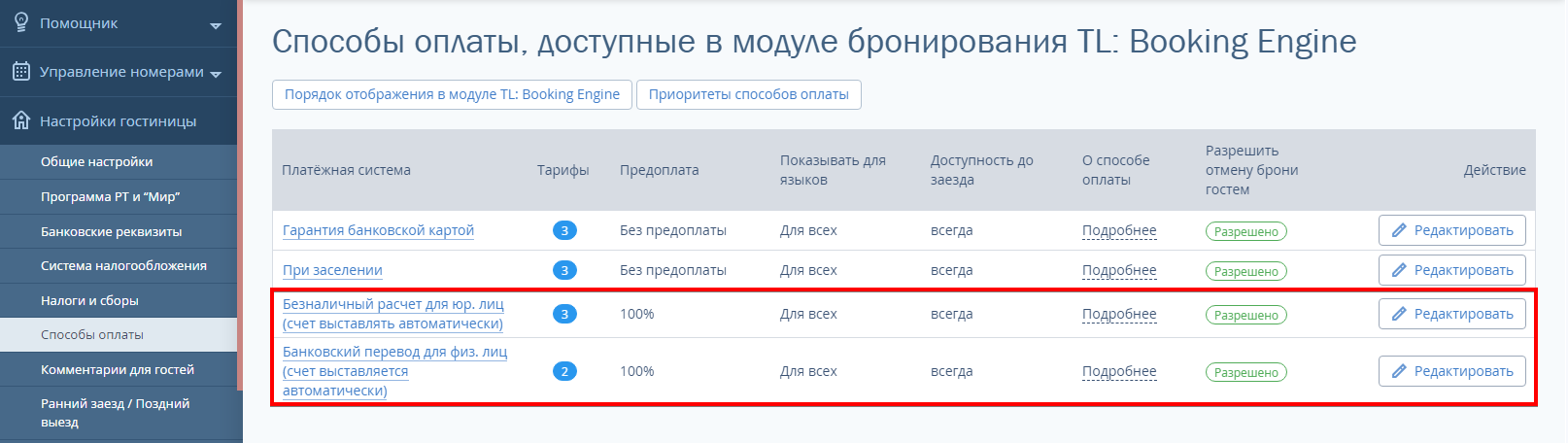 2. Перейдите в раздел «Настройки гостиницы» → «Способы оплаты» и кликните на название способа оплаты или на кнопку «Редактировать».