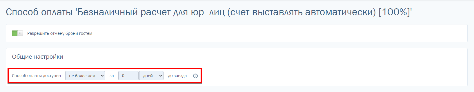 3. В пункте «Способ оплаты доступен» по умолчанию установлено «Не менее чем за 3 дня до заезда». Это означает, что гость сможет выбрать этот способ оплаты только в том случае, если между датой бронирования и датой заезда не менее трех дней — для того, чтобы гость успел оплатить проживание по счету до заезда. Если вы хотите предоставить гостю больше или меньше времени на оплату, отредактируйте доступность способа оплаты.