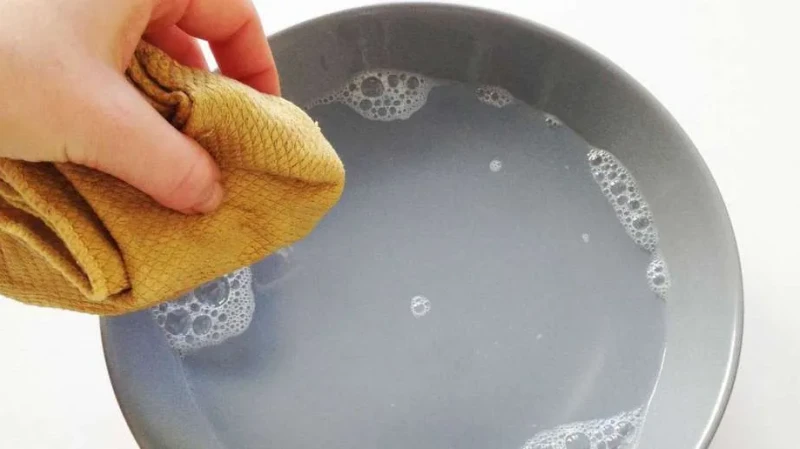 Иногда помогает обычный раствор из средства для мытья посуды. Две чайных ложки необходимо развести в половине стакана воды. Наносить его можно при помощи губки. Любые свежие следы можно оттереть и меламиновой губкой.