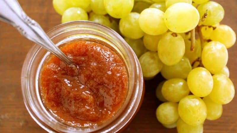 Любите готовить варенья, джемы и конфитюры? Приготовьте джем из винограда. Ягоды положите в кастрюлю и на слабом огне прогревайте, пока они не лопнут и не дадут сок. Снимите с огня и процедите. Подавите ягоды толкушкой, чтобы извлечь максимум сока, шкурки удалите, сок верните в кастрюлю. Добавьте сахар и лимон с кожицей (без косточек!), нарезанный средними дольками. Увеличьте огонь до среднего и варите, постоянно помешивая, до загустения. Разложите по банкам. Всё! Никаких многократных заливок и долгой варки. Мы же обещали простые рецепты из винограда, исполняем обещанное!
