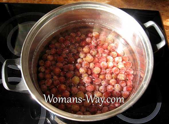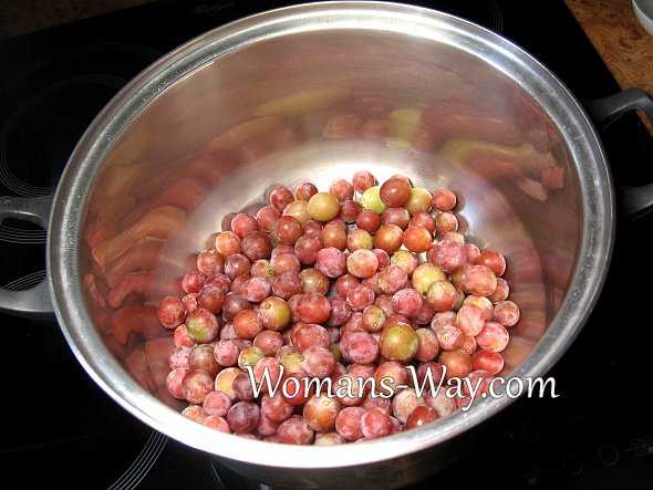 Для этого достаем наш продукт из морозилки и укладываем в кастрюлю уже отделенные от стеблей виноградины. Мыть и размораживать их не надо, мы тщательно вымыли их перед замораживанием.