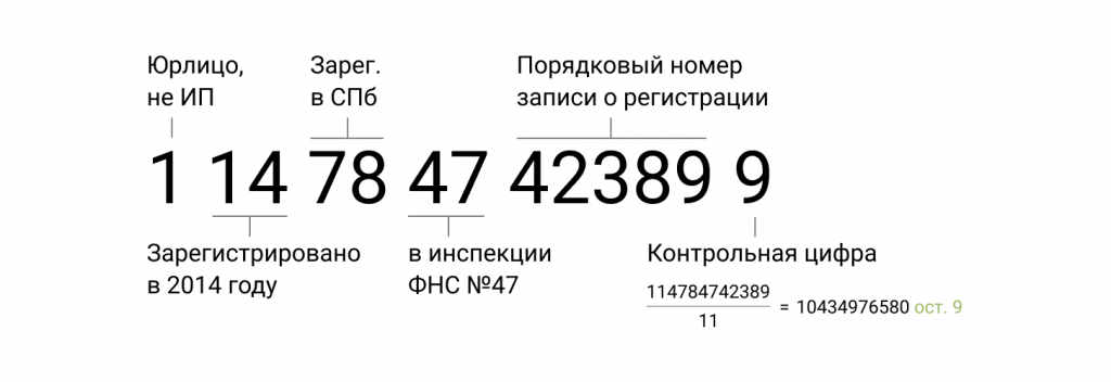 ОГРН состоит из 13 символов. Разберем, что значит каждый знак, на примере ОГРН 1147847423899.