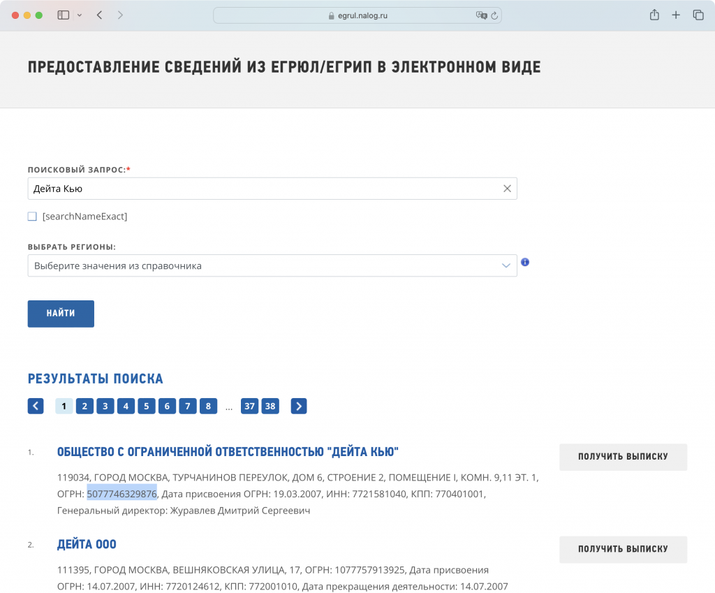 Допустим ИНН 500100732259, согласно данным цифрам получаем следующую информацию: