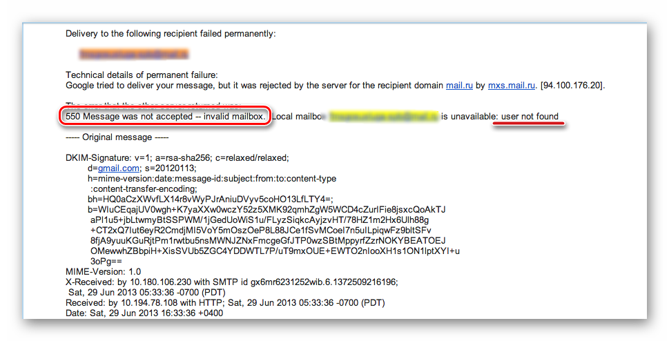 Якщо при спробі відправити повідомлення користувачу ви отримали повідомлення «550 Mailbox unavailable», значить, що такої адреси не існує, він заблокований або видалений.