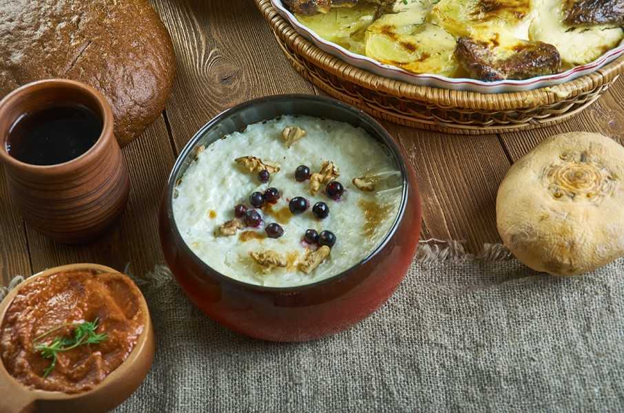 Орехи обдать кипятком, очистить от кожицы, обжарить на сковороде и размять в ступке, добавляя немного теплой воды. Тем временем молоко вылить в чугунную посуду и отправить в печь (духовку). По мере разогревания жидкости будет появляться пенка, которую следует снимать в отдельную посуду. Оставшееся молоко поставить на плиту и сварить в нем манку (без комочков). Должна получиться довольно густая каша. Добавить в нее измельченные орехи, масло, сахар, специи. На дно эмалированной посудины выложить кашу (примерно 0,5-1 см). Второй слой – пенка. Третий – снова каша, которую также накрыть пенкой. Сделать столько слоев, сколько получится. Последнюю часть каши смешать с вареньем. Затем отправить блюдо на 30 минут в духовку, разогретую до 100 градусов. Подавать с орехами и вареньем в той посуде, в которой запекалась.