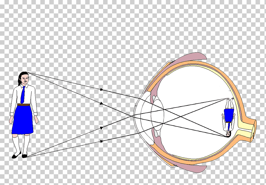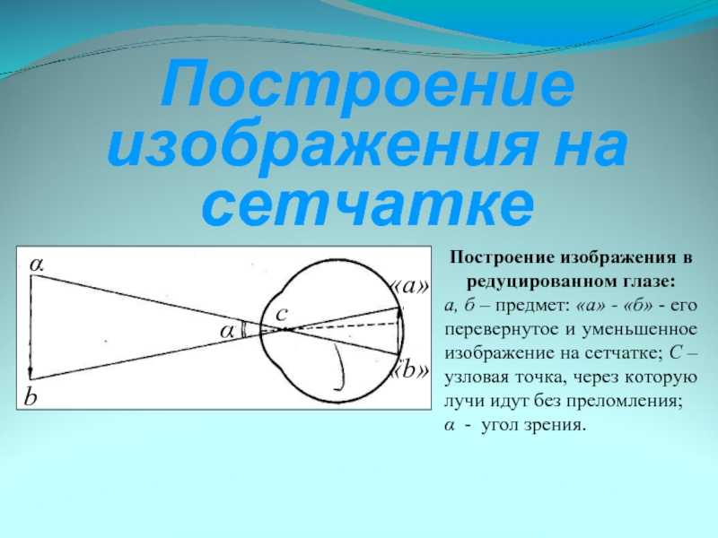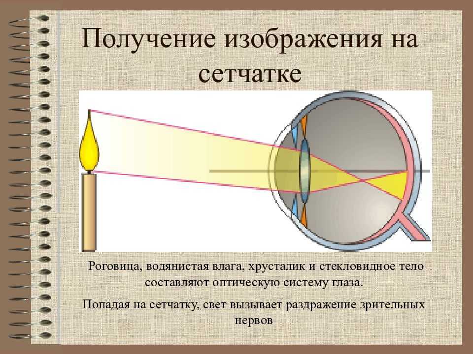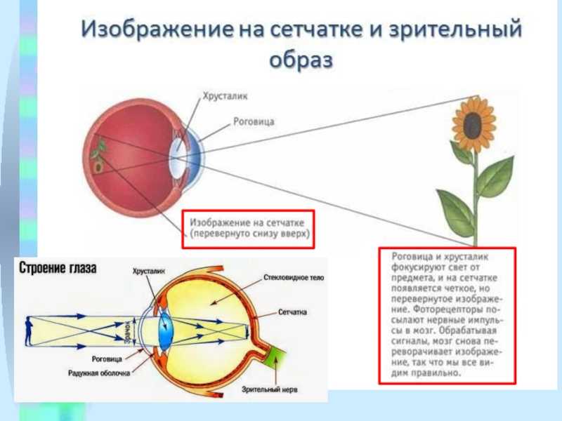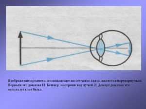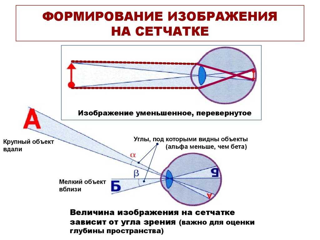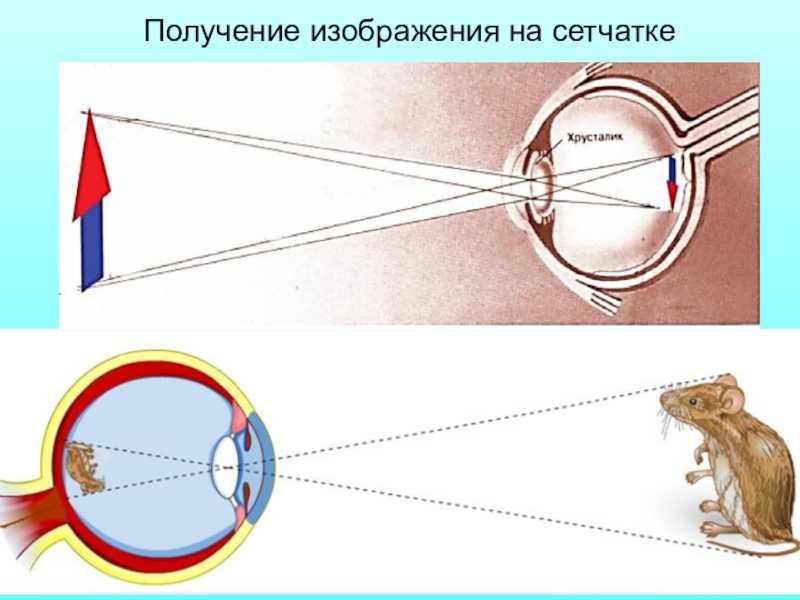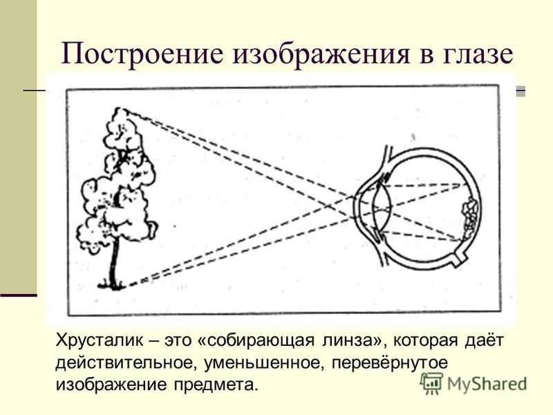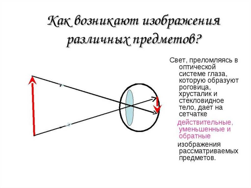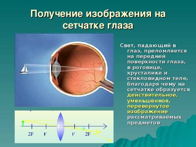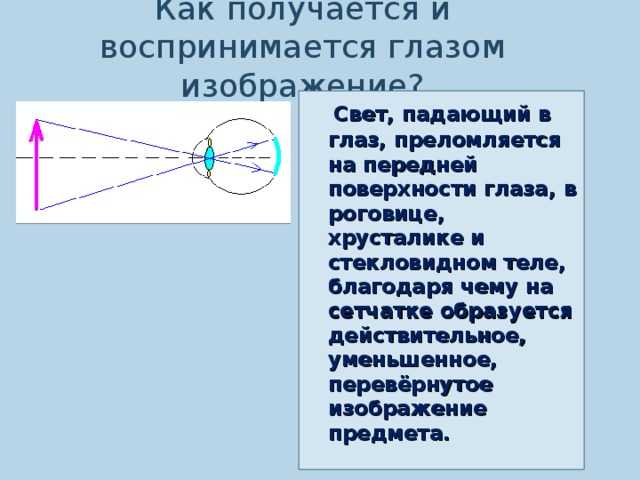 Свет, падающий в глаз, преломляется в хрусталике, как в линзе, и, попадая на сетчатку, образуют там действительное, уменьшенное, перевернутое изображение рассматриваемых предметов.