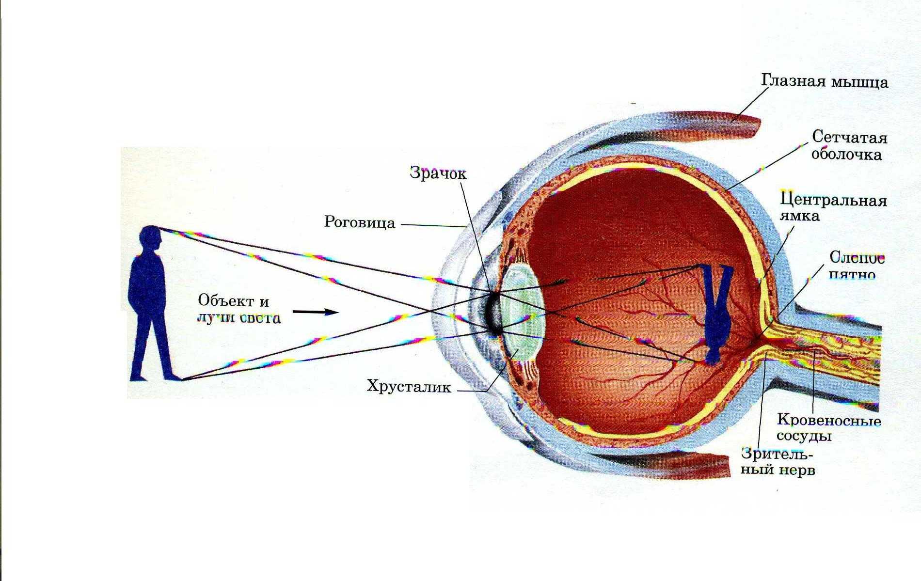 Образование изображения начинается с попадания света на роговицу глаза — прозрачную защитную пленку, которая находится спереди глазного яблока. Затем свет проникает через радужную оболочку глаза и попадает на хрусталик.