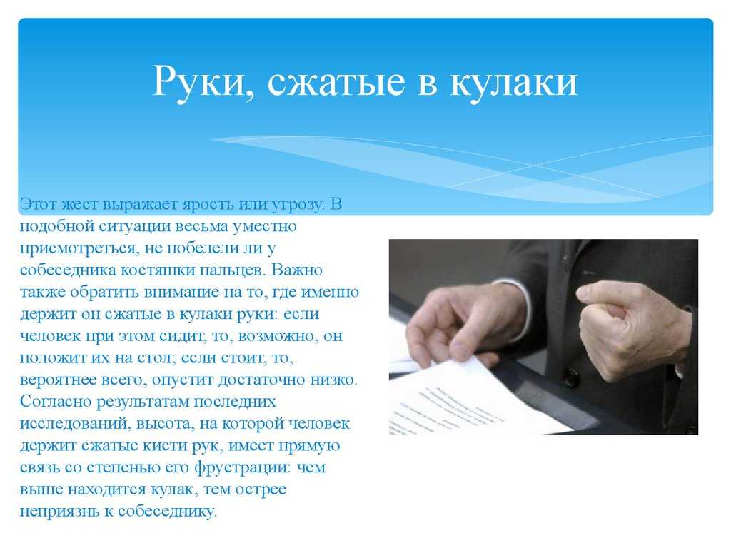 закрываются перед грудью. Кулаки сомкнуты четырьмя пальцами, а большой палец слегка согнут.