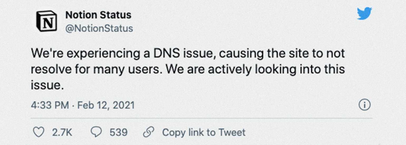 Позже ребята из Notion сообщили TechCrunch, что у них возникли неполадки с DNS, которые уже почти решены. О статусе пообещали регулярно отписываться в Twitter.