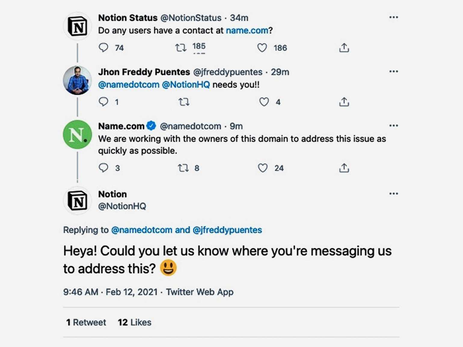 В твите, который потом быстренько удалили, Notion спрашивал у подписчиков личный выход на ребят из хостинга Name.com — на нём крутится домен notion.so. В ответ Name.com твитнул, что «работает с держателями домена, чтобы решить проблему как можно быстрее». В Notion этому удивились и иронично ответили: «А не подскажете, куда именно вы нам пишете?»