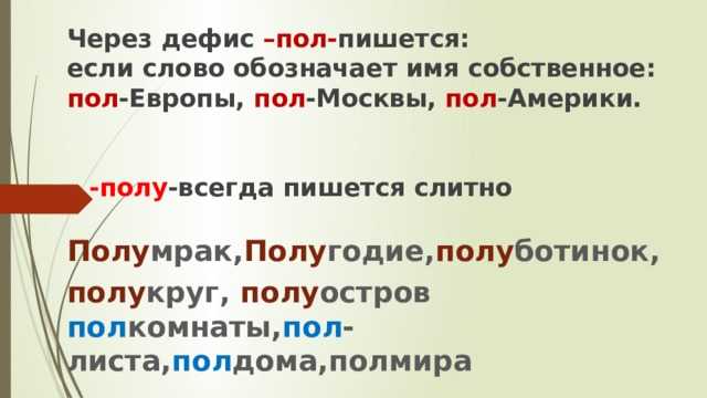 • пол, нескл. (неол. разг.). Половина. употр. в указаниях получаса, напр. пол пятого, в пол пятого (половина пятого, в половине пятого), причем встречаются и слитные написания: полпятого, в полпятого. Толковый словарь Ушакова
