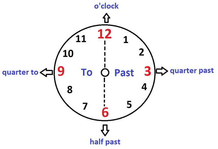 Когда мы говорим о пятнадцати минутах в русском языке, то обычно используем слово «четверть». Англичане для этого используют слово « quarter ». Только если минутная стрелка показывает 15 минут — это будет quarter past (четверть после) и будет назван предыдущий час, а если минутная стрелка будет на отметке в 45 минут — это будет quarter to (четверть до) и будет назван следующий час.