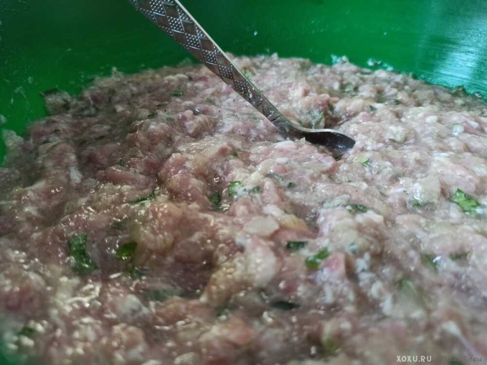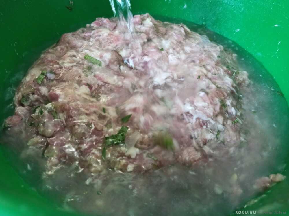 Перемешали получившийся фарш, и заливаем водой из кувшина. Примерно 0.5 литра. или даже больше. Тут принцип такой, чтобы получившийся фарш был жидким, но не сильно. Как только ложка поставленная в него, начнет падать — значит воды хватит. Проверим на следующем этапе. По фото ниже, можете оценить примерно кол-во воды. А также, посмотрите фарш на хинкали, уже в готовом виде.