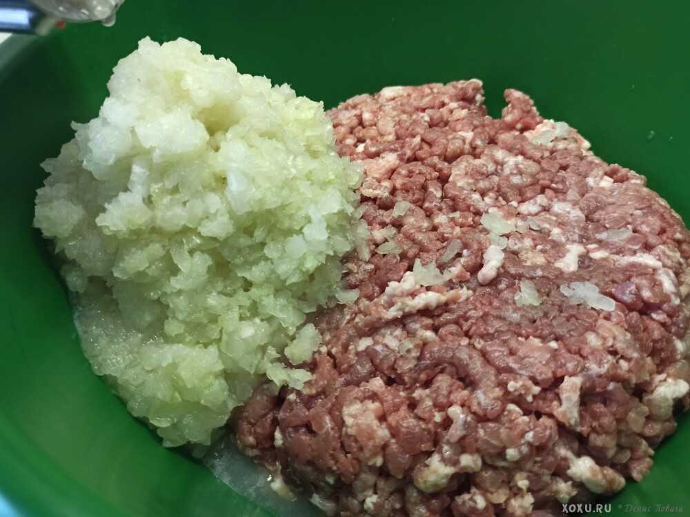 Мелко рубим мясо и шинкуем лук, или пропускаем через мясорубку (последний вариант, более быстрый и заманчивый):