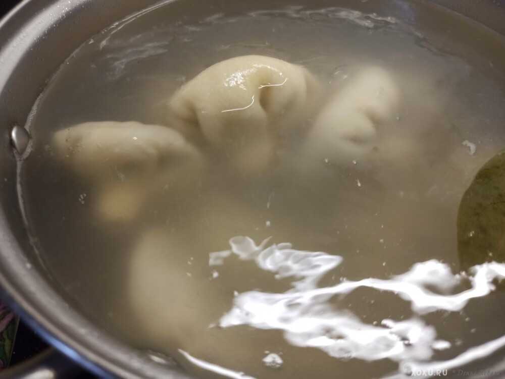 Хинкали варят в соленой воде с лавровым листом, стараясь, чтобы они не прилипли ко дну