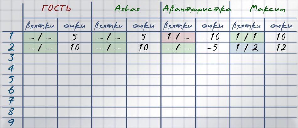 Столбец покериста разделяется на взятки и финальное число набранных за раунд баллов.