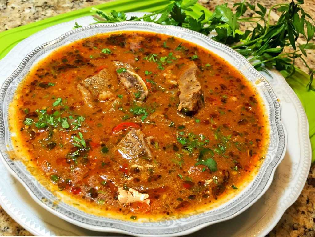 Что традиционно кладут в суп харчо — специи — хмели-сунели, зерна кориандра, острый перец, шафран, барбарис; — измельчённые ступкой грецкие орехи (50 грамм очищенных); — вместо помидоров, в классический суп харчо добавляют гранатовый сок (в идеале — свежей выжимки, без сахара), свежую алычу (полстакана), ткемали из сладких сортов сливы или тклапи (3 столовых ложки) — пастилу из алычи. В крайнем случае, добавляют нарезанный чернослив (8-10 штук). — из зелени в суп харчо добавляют петрушку (зелень и корень), майоран, базилик, мяту, кориандр и/или кинзу. Считается, что много зелени в харчо не бывает. — дополнительно в суп можно добавить четверть стакана соевого соуса для придания харчо остринки.