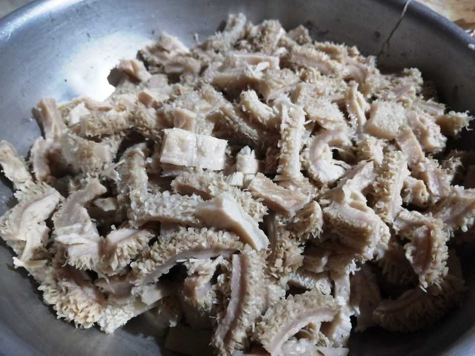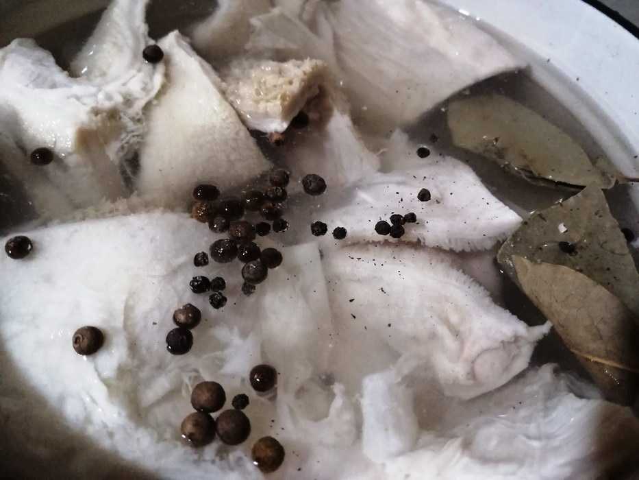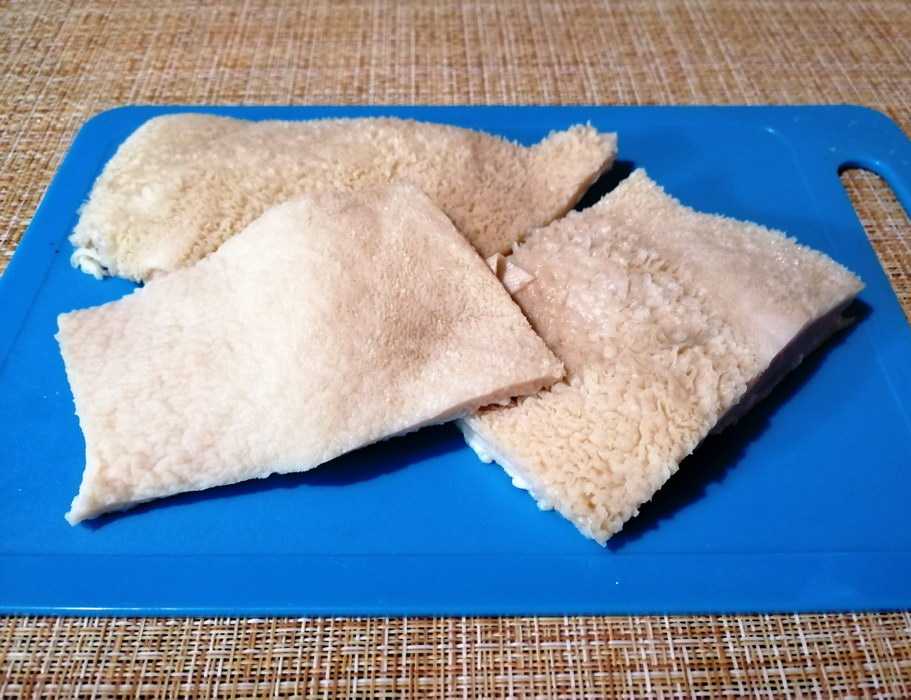 Чтобы облегчить себе жизнь нужно приобретать рубец полностью очищенный, чем вы сэкономите время. Если такого найти не сможете, приобретайте нечищеный, при этом выбирайте наиболее белые куски. Дальнейшую подготовку поделим на три этапа, и рассмотрим каждый по отдельности.
