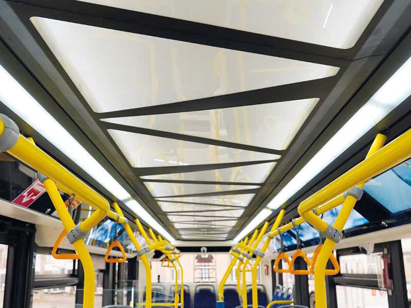 Отдельного описания заслуживает салон. Внутри 33 сидячих места. Номинальная заявленная вместимость — 96 человек, но при желании вместятся и все 100. На поручнях — USB-разъёмы для подзарядки гаджетов. Под потолком над окнами размещены видеомониторы. Изображение на них подаётся из диспетчерской через интернет. Приём сигнала обеспечивает wi-fi-роутер с SIM-картой. Он же обеспечивает связь между банком и валидаторами бесконтактной оплаты. Кстати, в кабине у водителя установлен аппарат, на который приходят все оповещения о транзакциях.