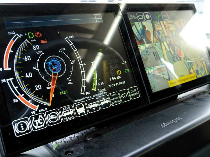 Перед водителем вместо приборной панели — 2 монитора. Причём сенсорных, то есть именно на них он управляет климат-контролем, выбирает информацию для маршрутоуказателей. Тут же он видит изображение с 9 камер в салоне и снаружи. К слову, разработкой программного обеспечения занимались специалисты отечественной компании.