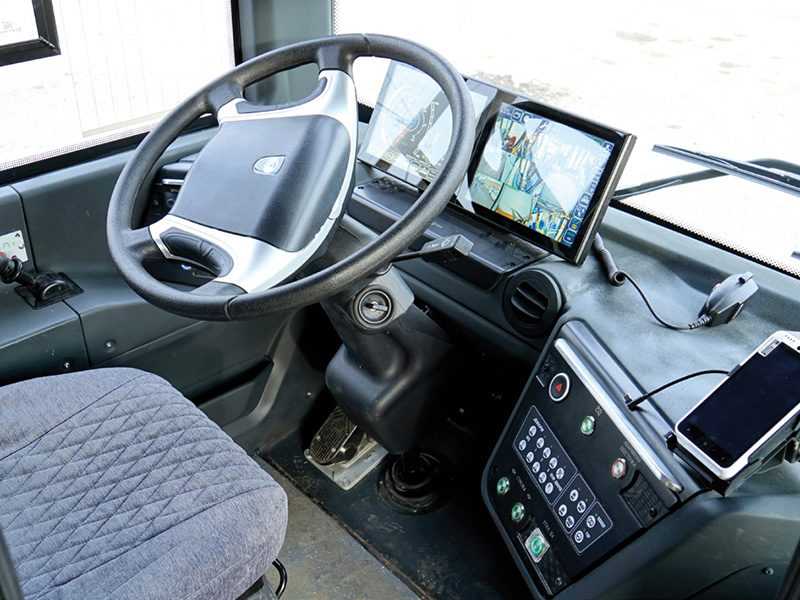 Входим в кабину и… очень хотелось написать, что удивляемся, но есть ощущение дежавю. Рабочее место водителя чем-то напоминает кабины современных тягачей с планшетами вместо панели приборов. Здесь и сиденье на пневмоподушке с эффектом памяти, а также с подлокотниками. Положение кресла можно отрегулировать наклону и продольному перемещению. Под ногами две педали — газ и тормоз.