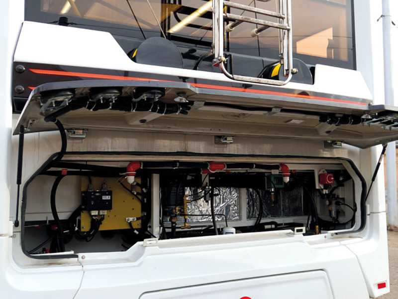 Пока мы перемещаемся в кабину, отмечаем, что в передней части салона под лобовым стеклом есть закрытый отсек, визуально не бросающийся в глаза. Оказывается, туда поместили бак ёмкостью 20 литров для омывающей жидкости. Не особо удобное решение, зато за раз налил и надолго.
