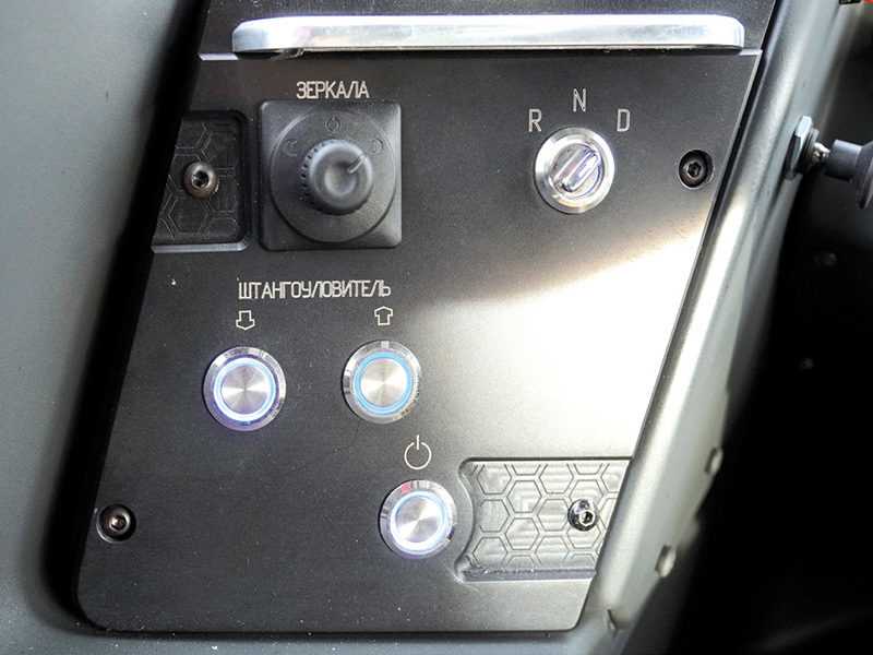 Управление трансмиссией расположили на панели штангоуловителей слева от рулевой колонки — тут всё просто: R — назад, N — нейтралка и D — вперед. Рядом — джойстик электропривода зеркал заднего вида.