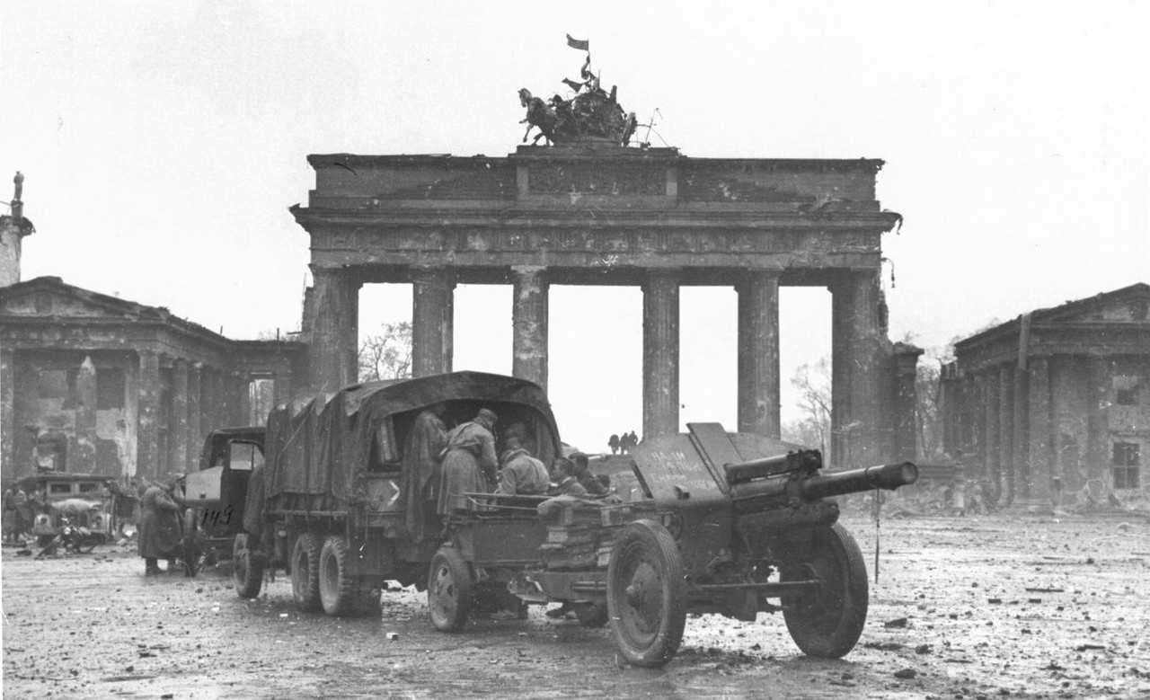 Советские грузовики с гаубицами М-30 перед Бранденбургским воротами, 1 мая 1945 г.