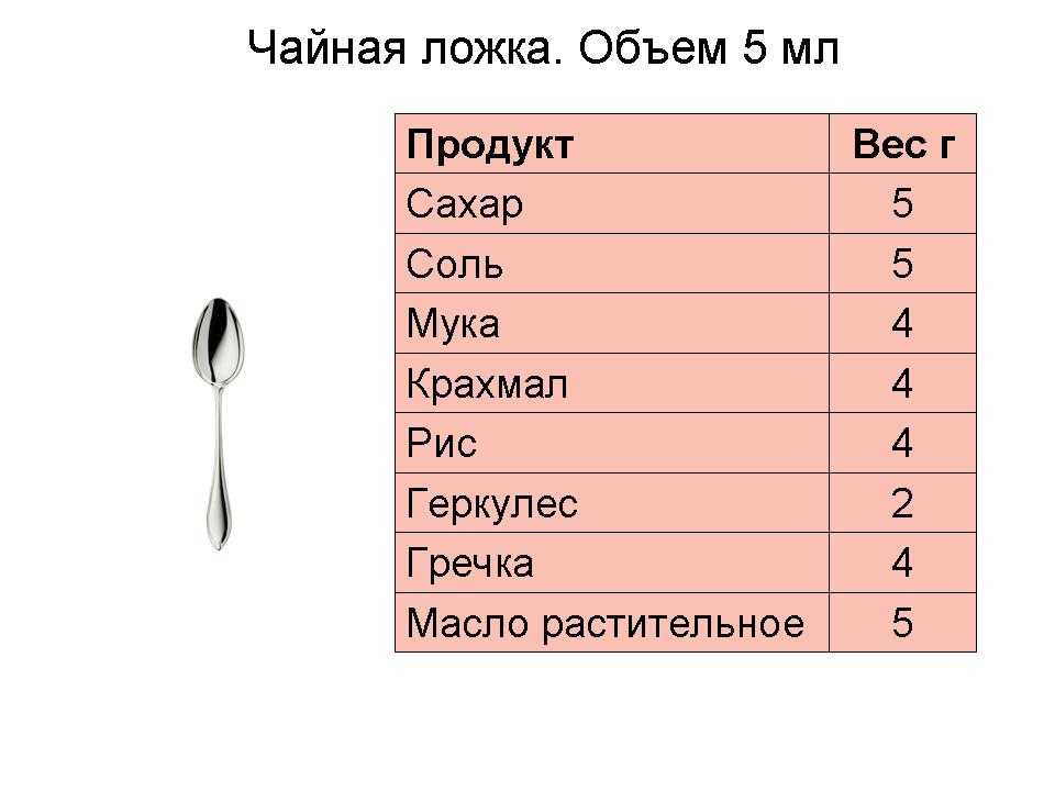 | чайная ложка сладкого | Вес, грамм (г) | Объем, миллилитры (мл) |
