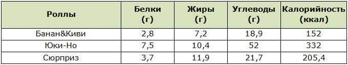 Давайте теперь подсчитаем калорийность роллов, которые чаще всего покупают россияне: