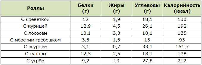 Таблица калорийности суши и роллов на 100 грамм продукта, соотношение БЖУ: