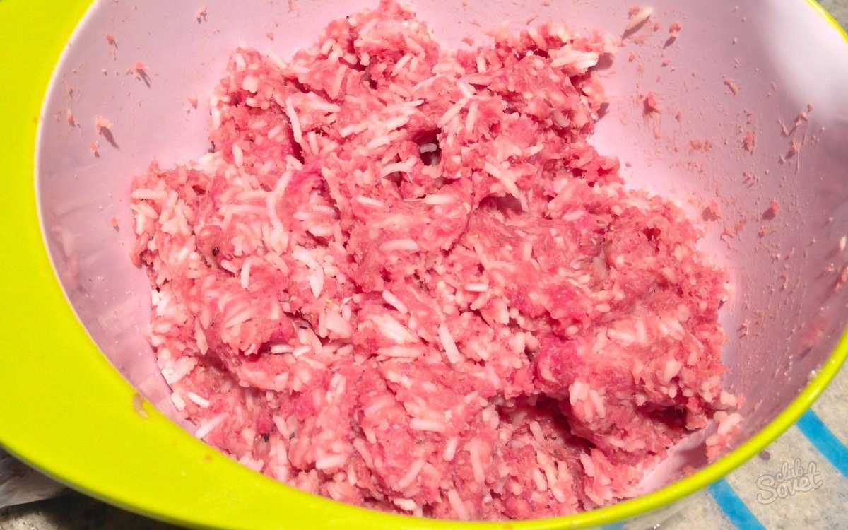 - Подготовленный заранее свино-говяжий фарш выложить в миску, добавить к нему лук, тертый картофель и тыкву. Начинку приправить перцем и солью. Перемешать фарш, слегка отбивая его, чтобы убрать лишний воздух.