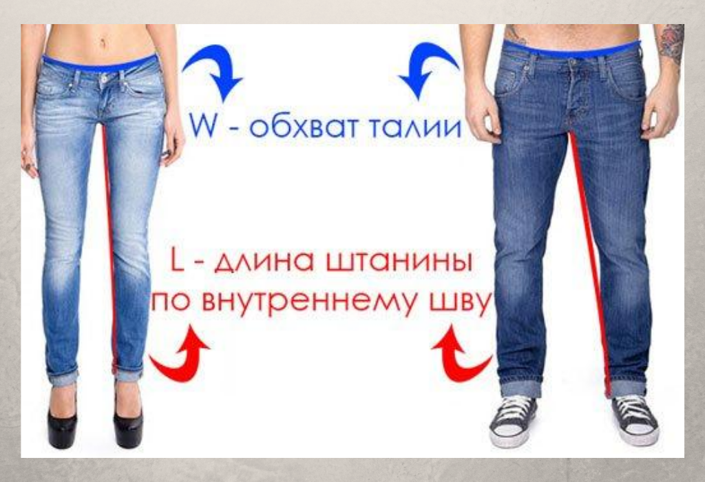 Одним из самых важных критериев при покупке – правильный выбор размера джинсов. Брюки не должны висеть и в то же время легко застегиваться. Так как джинсы – американское изобретение, и полнота, и длина их традиционно обозначаются в дюймах и определяется при помощи двух параметров: длины и полуобхвата талии. При этом длина считается от места разделения штанин до начала ступни. То есть – это расстояние внутреннего шва, которое обозначается литерой L или «Inseam». Измерив расстояние по кругу самого узкого места торса, можно вычислить полуобхват талии, которое прописывается на изделии буквой W.
