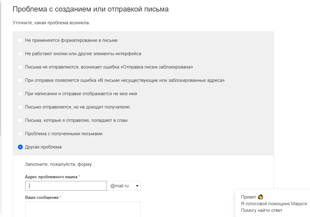 Не помогло – обращайтесь в Помощь Mail.Ru. Переходите в раздел «Письма» и ищите соответствующий пункт. Потом отметьте тип проблемы и отправьте запрос. Сотрудники решат проблему.