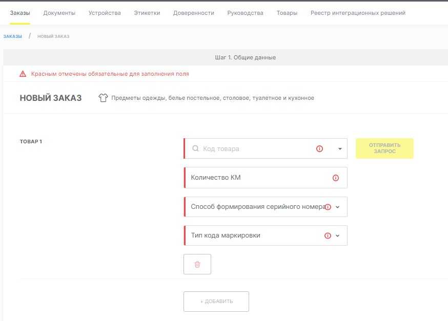 После создания карточек, на каждую единицу продукции нужно выпустить коды маркировки. Заказать их можно в станции управления заказами или по другому СУЗ. Для этого переходим в “Управление заказами” – Заказы” и нажимаем на кнопку “Создать”.