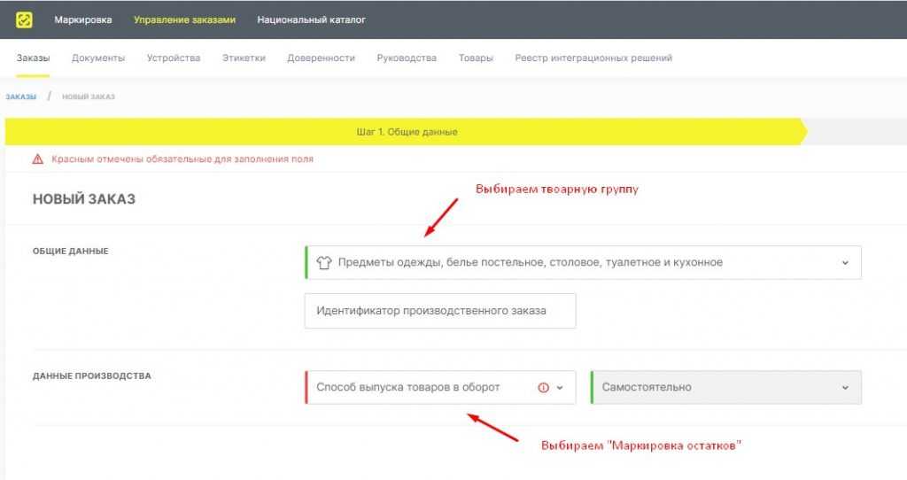 В документе выбираем вашу товарную группу и способ выпуска товаров в оборот “Маркировка остатков”.