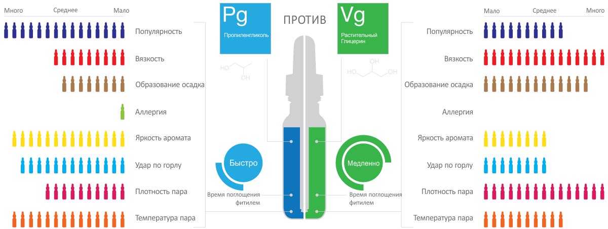 Пропиленгликоль отображает лучший вкус и больший горловой удар. Он менее вязкий, чем глицерин, поэтому его удобно использовать с тонкими испарителями. Такие жидкости могут также быть более легко впитываемыми в вату. Однако высокое содержание пропиленгликоля может вызывать больший раздражение горла и сушить слизистую оболочку в некоторых людях.