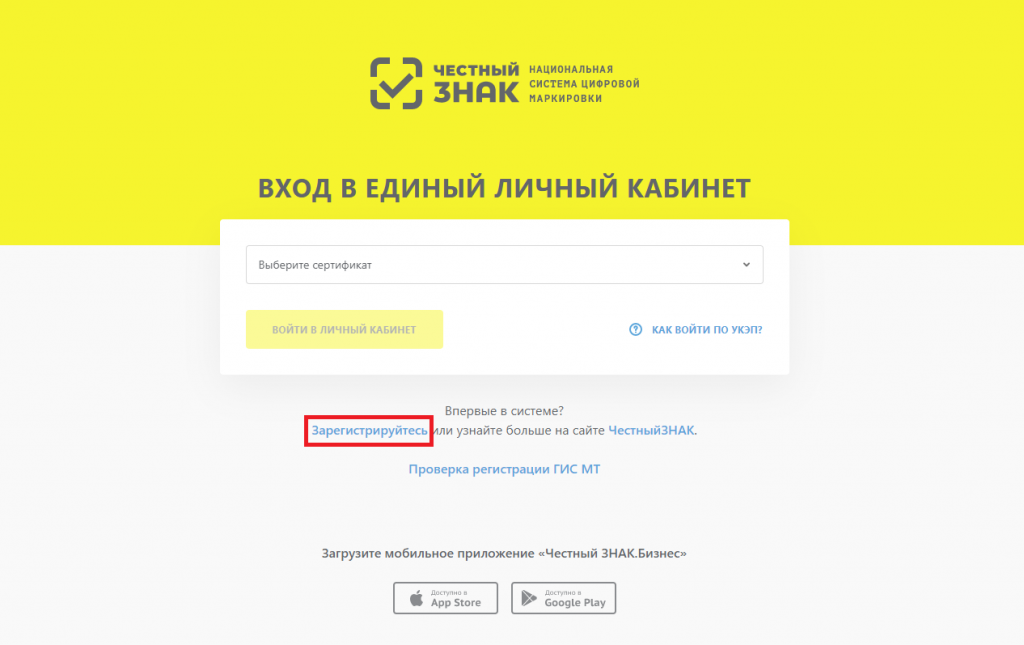 После успешной проверки сервис предложит зарегистрироваться на сайте в качестве участника оборота либо войти.