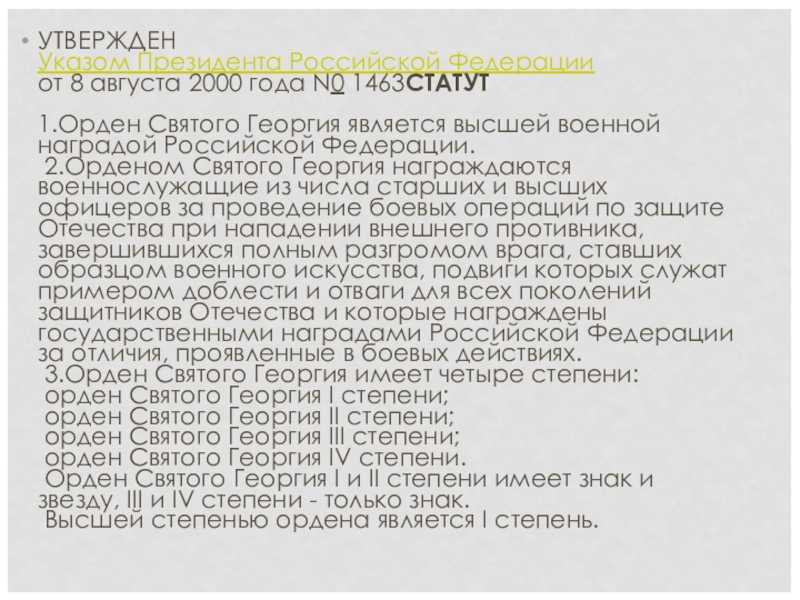 Слайд 9УТВЕРЖДЕН Указом Президента Российской Федерации от 8 августа 2000 года N0 1463СТАТУТ 1.Орден Святого