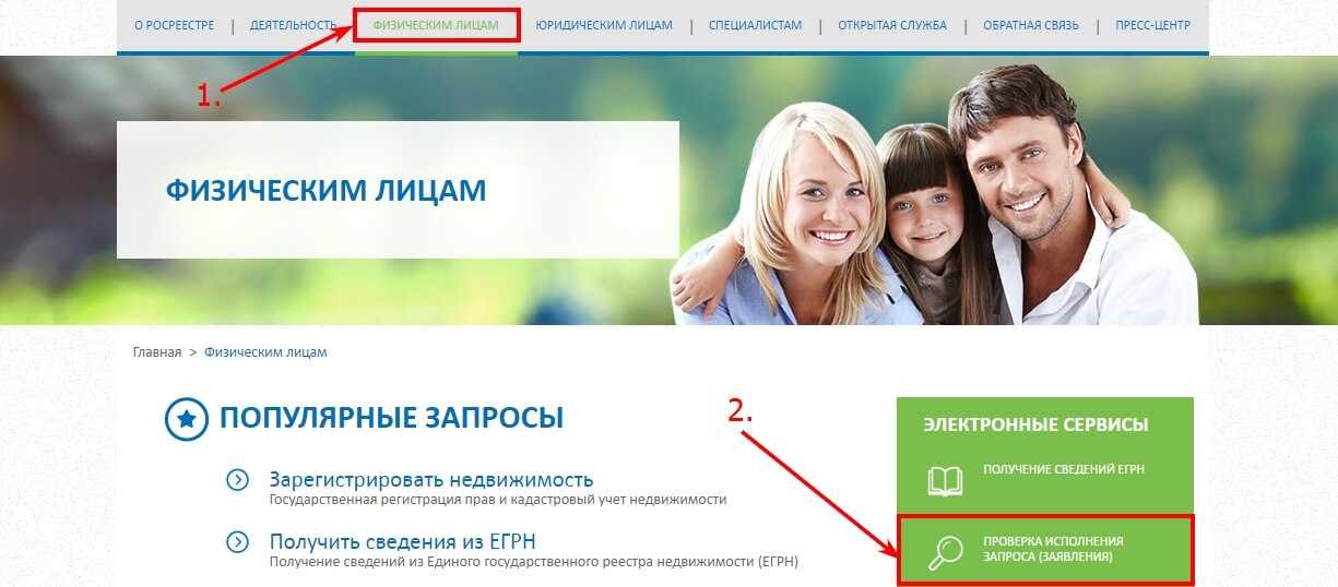 Чтобы узнать статус заявления МФЦ через Росреестр, следует выбрать вкладку «Физическим лицам». Далее выбирается «Проверка исполнения запроса», где прописывается номер заявления. Далее сервисом предоставляются данные касательно стадий рассмотрения обращения.