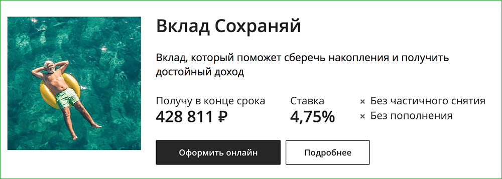 Для физических лиц, не являющихся владельцами премиальных пакетов услуг, вклад «Сохраняй» считается наиболее выгодным вариантом вложения денежных средств. Он имеет наибольшую процентную ставку и обеспечивает сохранность финансовых ресурсов, т.к. исключает возможность частичного снятия накоплений. Это оптимальное решение для тех, кто намерен не только избавиться от соблазна спонтанно потратить имеющиеся деньги, но и стремится увеличить сумму своих сбережений.