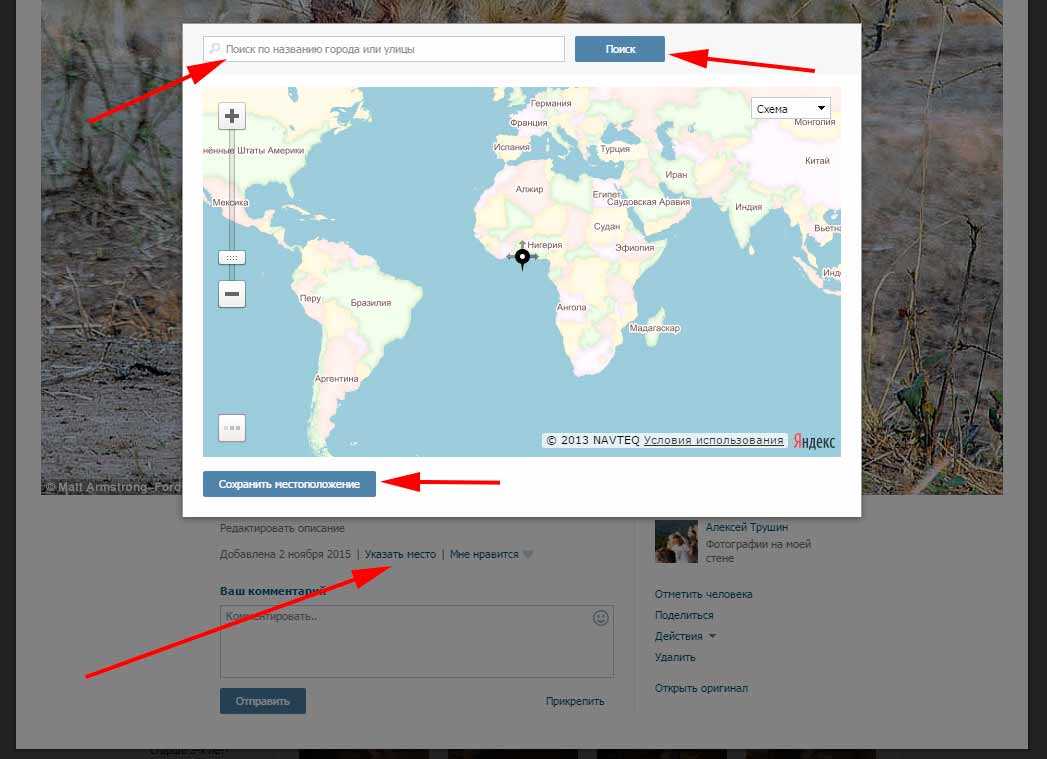 Если вы решили «зачекинить» снимок, который уже был сделан ранее, скиньте его на ваш компьютер. После этого воспользуйтесь любой социальной сетью, чтобы проделать все то, что описано чуть выше — залейте «фотку» и «определите» местоположение. Иногда можно ввести адрес самостоятельно.